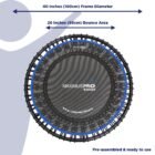 Dimensions: The frame is approx. 100cm (40 inches) in diameter, the mat surface is approx. 66cm (26 inches) in diameter and the rebounder stands 33cm (13 inches) from the ground